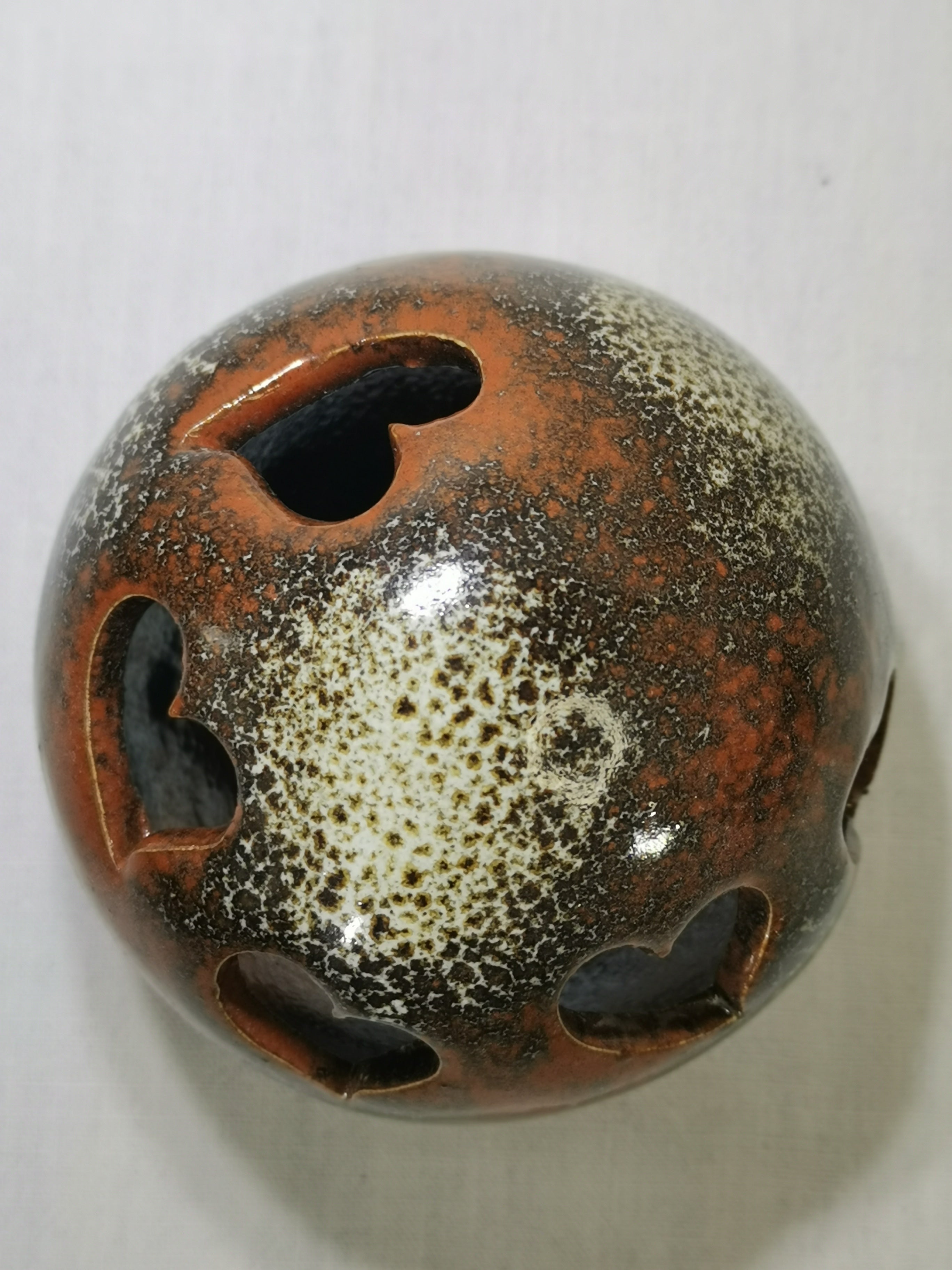 Ce photophore en céramique se distingue par sa forme sphérique et ses ouvertures découpées, qui laissent passer la lumière de manière douce et diffuse. L’émail, aux nuances profondes de brun, de noir et de beige moucheté, crée un jeu de textures minérales évoquant la terre et la matière en fusion.